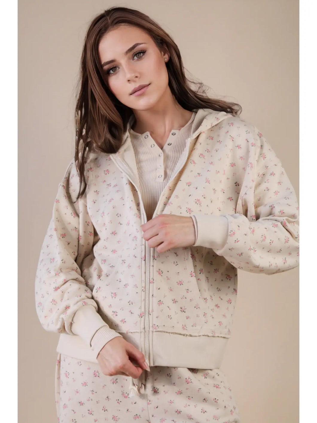 Stay cozy and cute in the Comfy Floral Zip Up Hoodie! Featuring a delicate floral pattern that adds a touch of charm, this playful hoodie comes with a convenient zipper and a snug hood to keep you warm on breezy days. Perfect for layering or lounging, it’s your new go-to for comfort with a fun, feminine twist.
