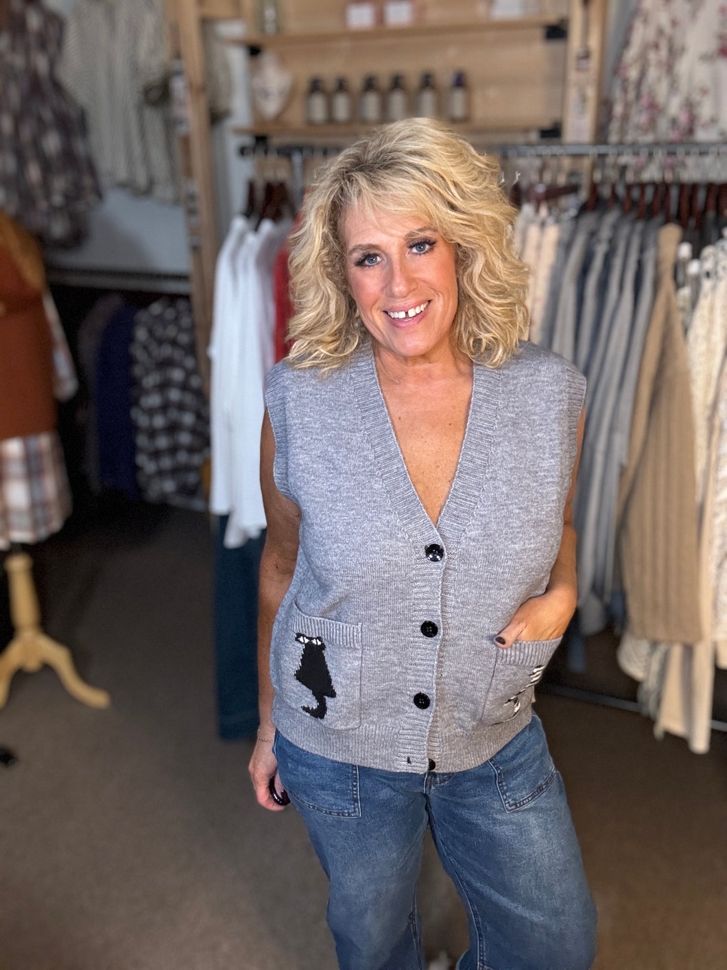 This playful sweater vest features a charming animal print design, perfect for layering over your favorite tops or pairing with rhinestone bodysuits for a quirky western-boho vibe.