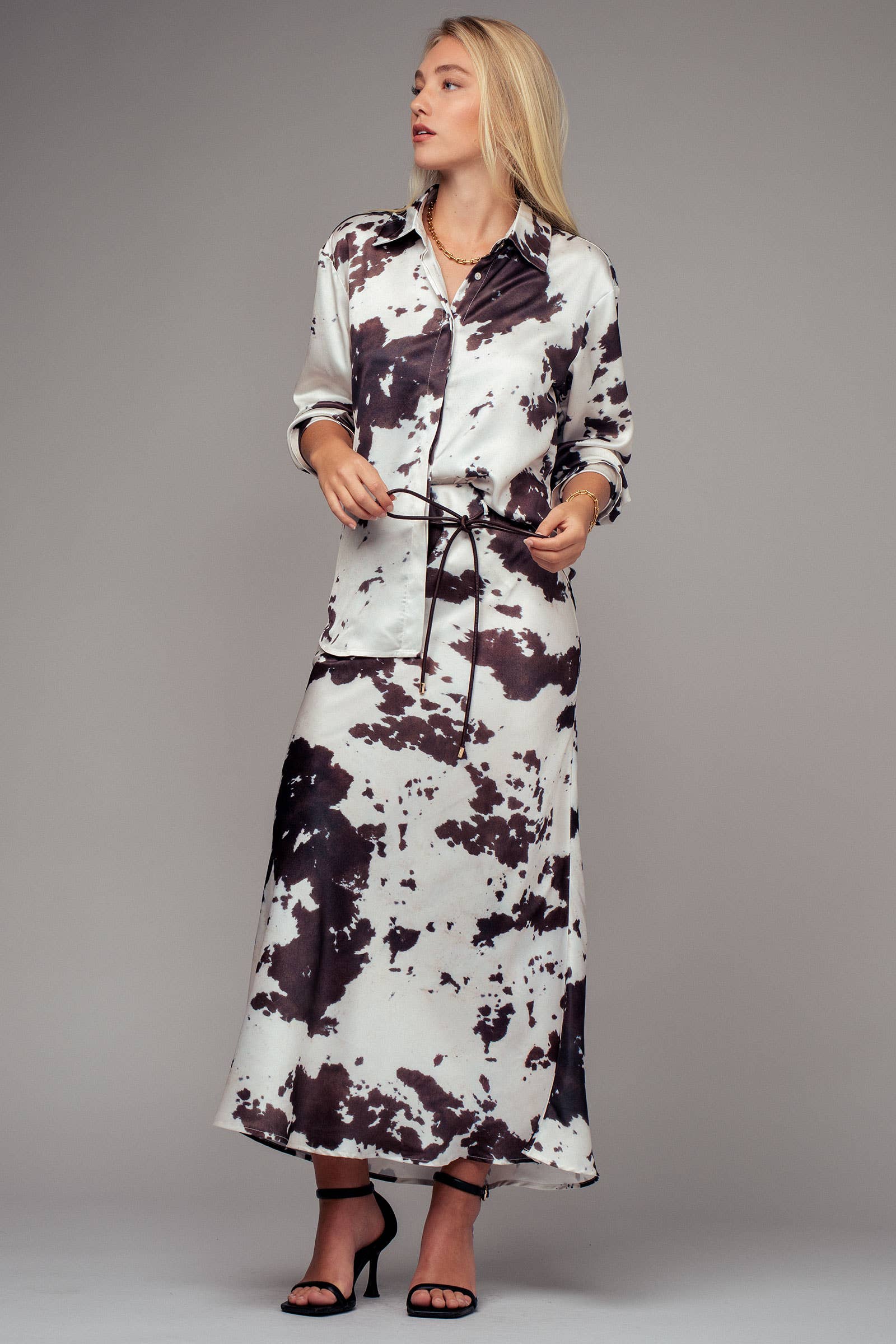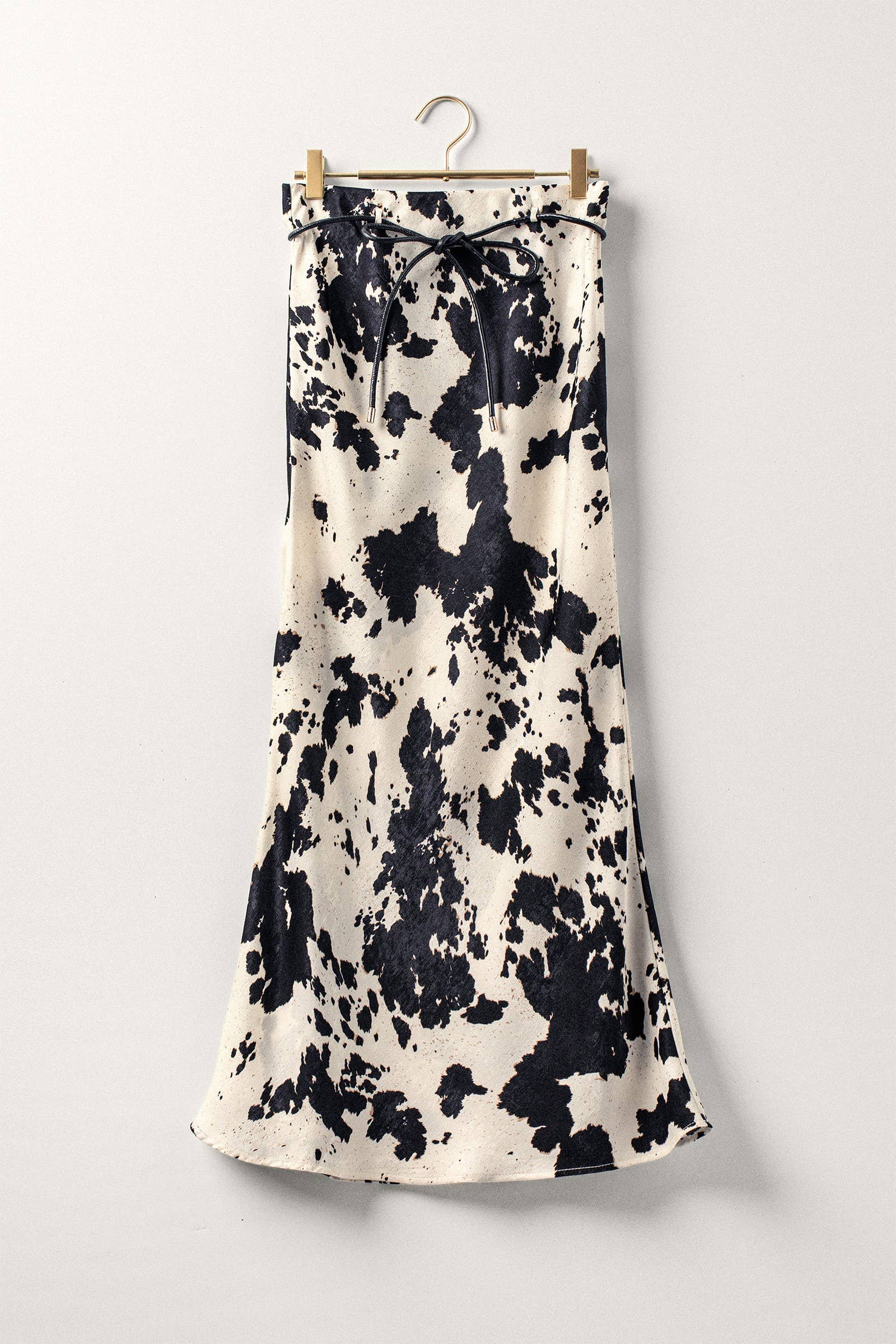 This satin midi skirt features a distinctive brown and cream cowhide print with a subtle sheen, finished with a slim adjustable drawstring waist for a customizable fit. The A-line silhouette gently flares at the hem, offering effortless movement and a flattering drape—perfect for both casual outings and elevated western-inspired looks.