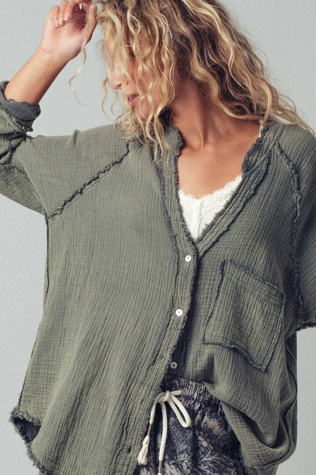 Embrace effortless charm with this Crinkled Gauze Button Top. Crafted from soft textured fabric, it features a playful button-down front and a flattering V-neckline. The raw edges add a touch of casual whimsy, making it perfect for easygoing days and spontaneous adventures.