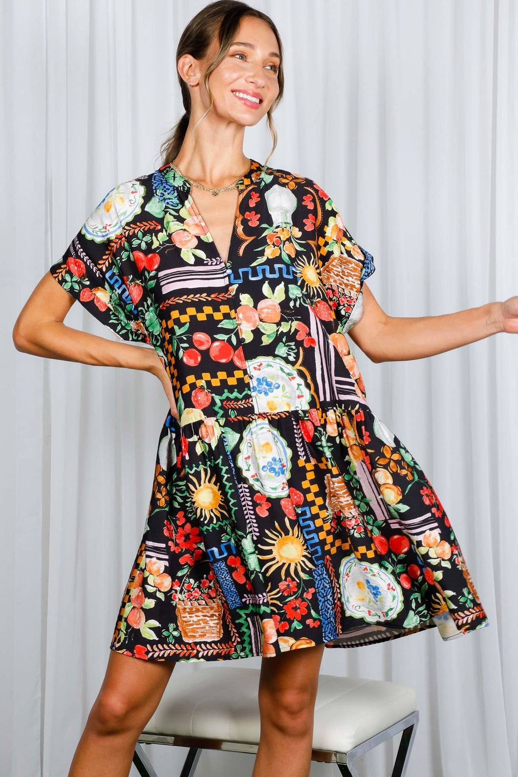 This playful Black Multi Print Mini Dress features a flattering V-neck and charming tiered hem that adds a flirty bounce to every step. The short sleeves keep it breezy and perfect for sunny days or lively nights out. A fun and stylish choice for your wardrobe!