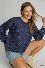 Saddle up in style with this Western Print Sweatshirt, featuring a relaxed boxy cut that's perfect for laid-back vibes. Crafted from cozy French terry fabric, it's soft enough for all-day wear while the eye-catching graphic print adds personality to your casual wardrobe. Whether you're channeling cowboy chic or just want a comfy layer with character, this sweatshirt delivers comfort without taking itself too seriously.