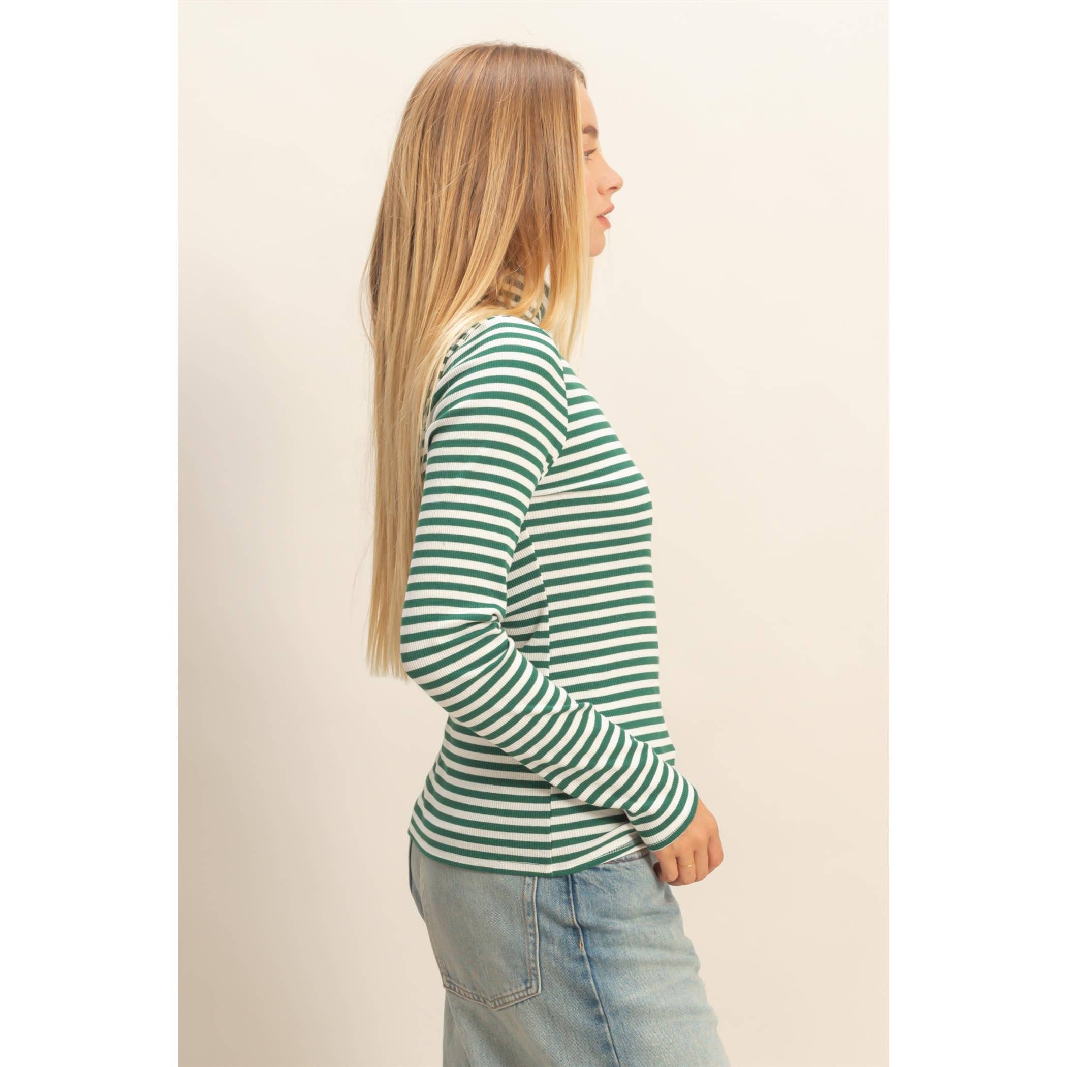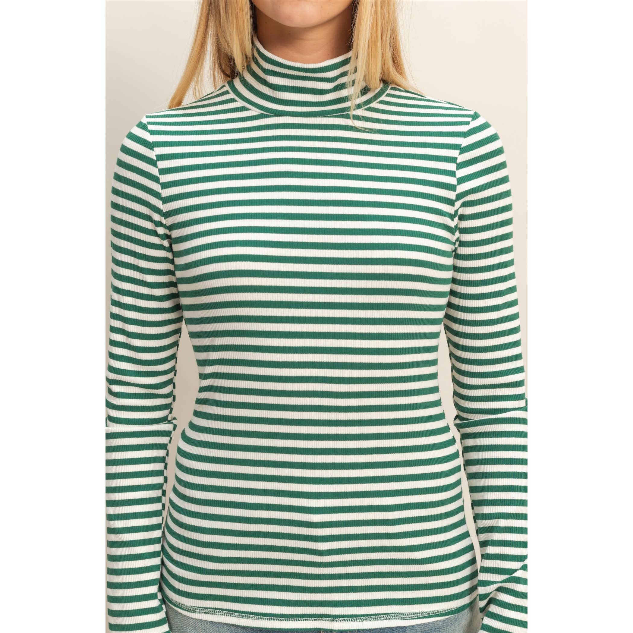 Explore modern minimalism with this fitted turtleneck top featuring horizontal stripes. Its streamlined silhouette makes it a perfect choice for layering under blazers or vests. Pair it with high-waisted jeans or a sleek skirt for a balanced day-to-night look. The design ensures comfort and versatility throughout various settings, be it casual outings or more formal engagements.