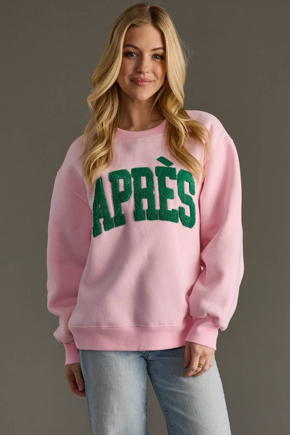 Cozy up in this charming light pink sweatshirt featuring textured "Apres" lettering in vibrant green across the front. Perfect for après-ski vibes or casual everyday wear, this playful piece brings a pop of color and personality to your wardrobe. The soft, comfortable fit makes it ideal for lounging, running errands, or styling with your favorite jeans. A fun statement piece that celebrates the good life!