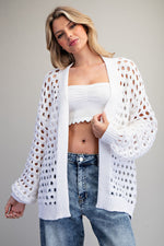 Throw on this breezy open knit cardigan and embrace effortless style! The airy mesh weave keeps things light and breathable, while those fun bubble sleeves add a playful touch to your everyday look. Designed with an open front for easy layering and finished with cozy ribbed trim at the cuffs and hem, this oversized piece is perfect for transitional weather or layering over your favorite tees and tanks.