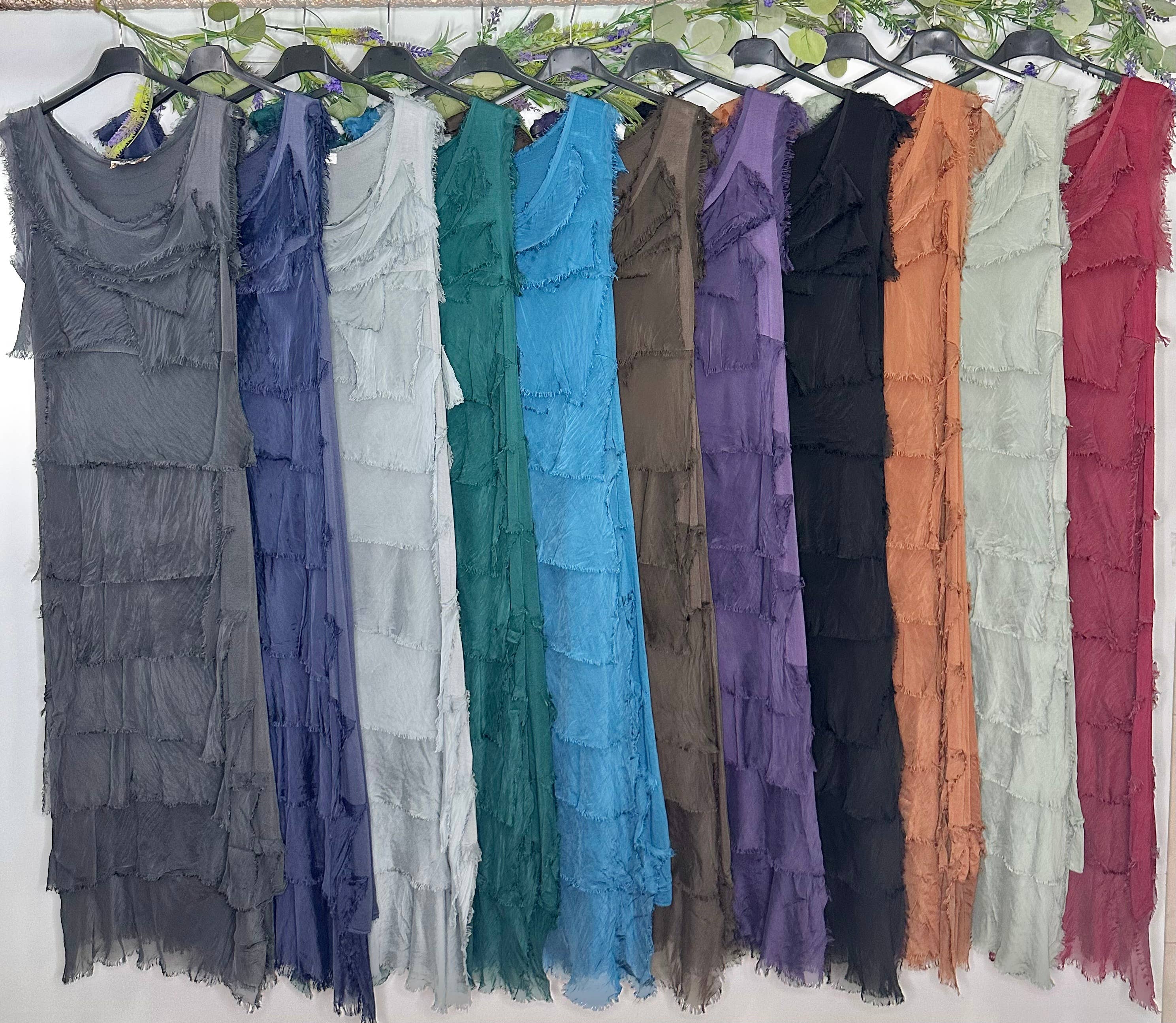 Super cute maxi silk ruffle dress. Perfect to dress it up or down. Viscose layered. Perfect piece to have on your wardrobe. Silks are a go to garment for any occasion. they are versatile, easy to match and make any outfit look amazing.